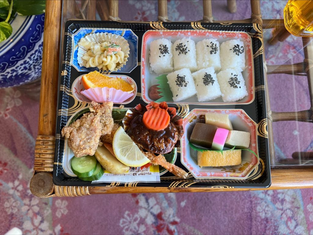 彼と一緒に、この絶景を前にお昼ご飯のお弁当を頂いている様子です。