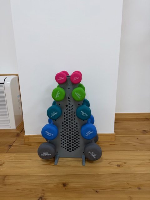 高性能なエアロバイクもあります。そして今回新しくカラフルなダンベルセットが入荷されました。
