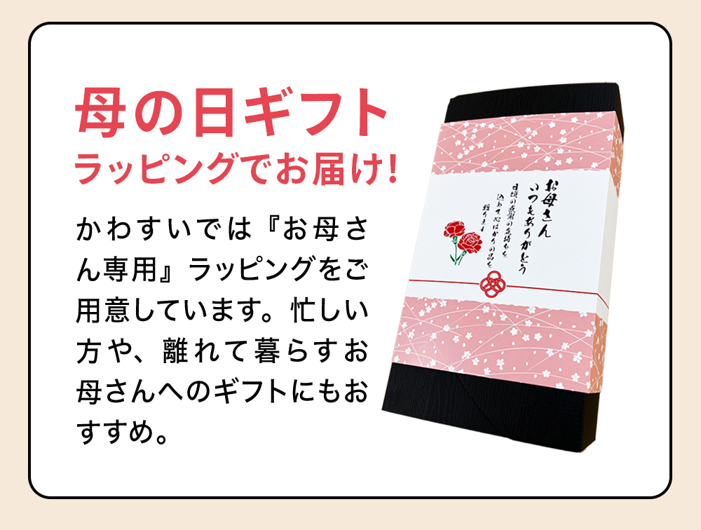他の画像を見る お母さんにありがとうの気持ちを込めて! [今年は5月10日]母の日限定ギフトボックス[母の日 プレゼント 贈答用]※こちらの商品は箱のみとなります。中身となる商品は別途ご一緒にご注文くださいませ。 WEB本店特別価格 ¥ 310 税込 詳細を見る お気に入りに登録する 販売期間 2026/04/01 10:00 〜 2026/05/19 9:59