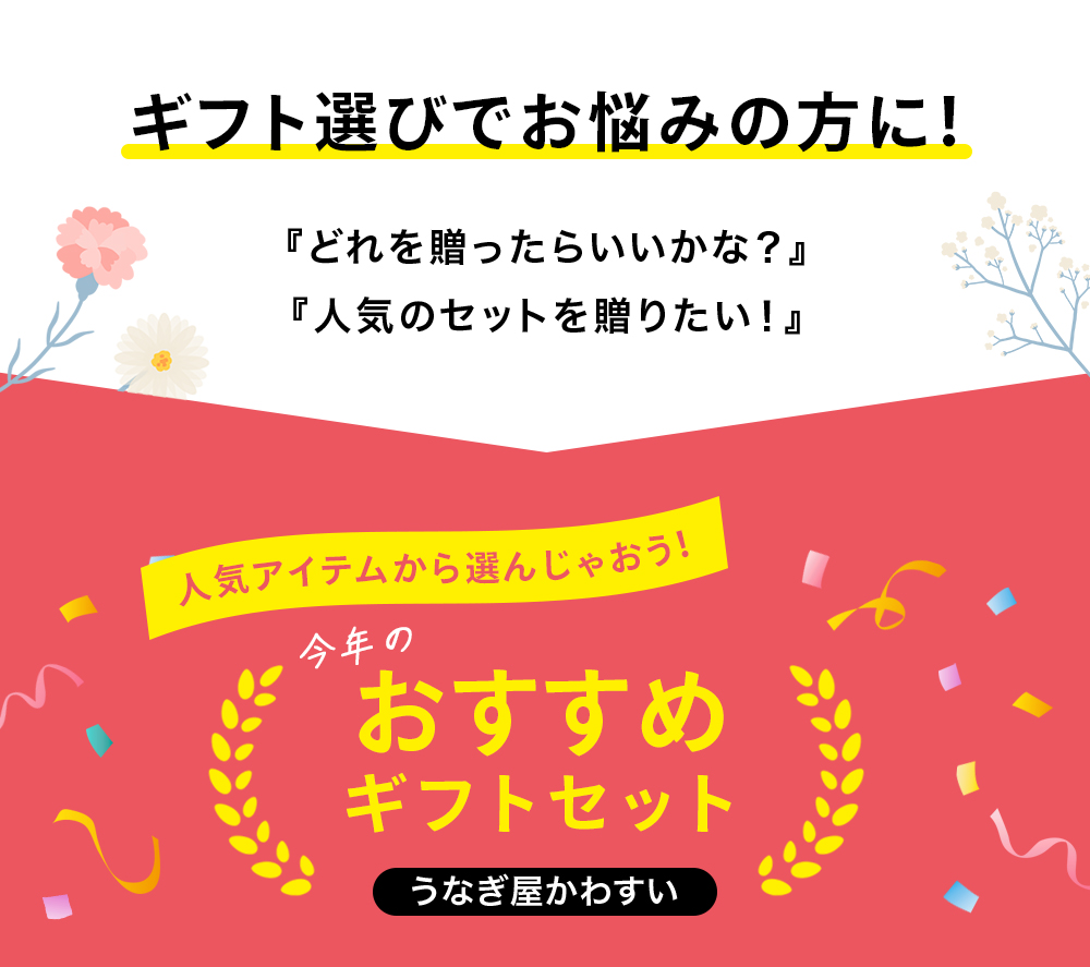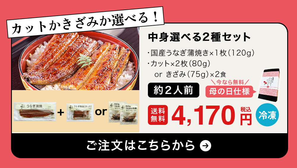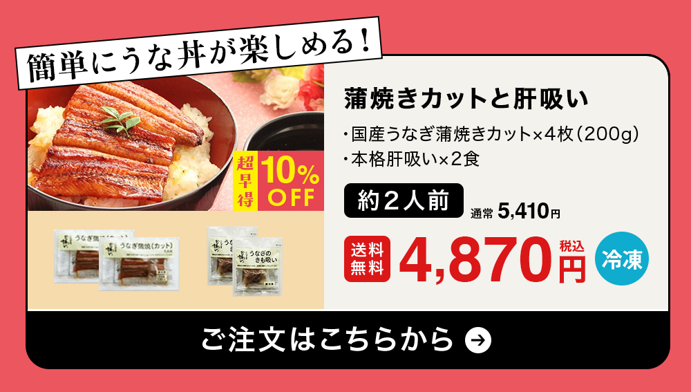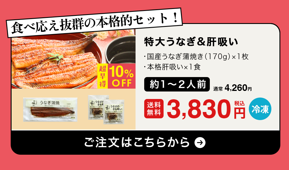 他の画像を見る お母さんに感謝の気持ちを込めた国産うなぎのギフトセット 【今年は5月10日 母の日ギフト】\超早割10%OFF/国産うなぎ蒲焼きカット4枚200g・本格肝吸い2食[山椒別売] 通常販売価格 ¥ 5,410 のところ WEB本店特別価格 ¥ 4,870 税込 詳細を見る お気に入りに登録する 販売期間 2026/04/01 10:00 〜
