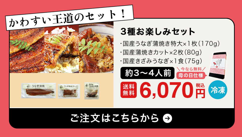 他の画像を見る 当店で一番人気! \超早割!母の日ボックスが無料/国産うなぎの3種お楽しみセット[お祝い お誕生日のプレゼントにも!] WEB本店特別価格 ¥ 6,070 税込 詳細を見る お気に入りに登録する