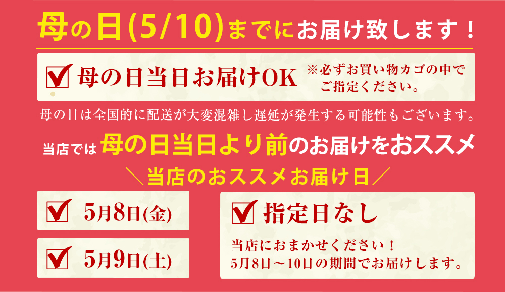 お届日のご指定がない場合は5月8日~10日お届け致します。