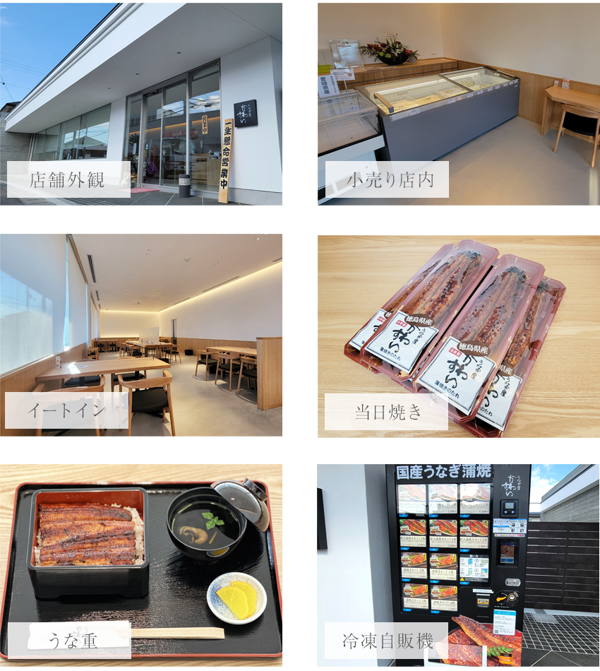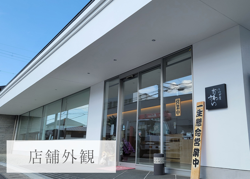 ~ 店舗案内 ~ 創業から五十余年、厳選した国産うなぎを自家製秘伝のタレでこんがり香ばしく焼き上げています。 そんな当店のその日の焼き立てをお楽しみいただきたいという 想いで、本社に「うなぎ屋かわすい 小売店」を併設。 その日に焼き上げた蒲焼きをお持ち帰りいただける他、店内には イートインスペースも設けております。
