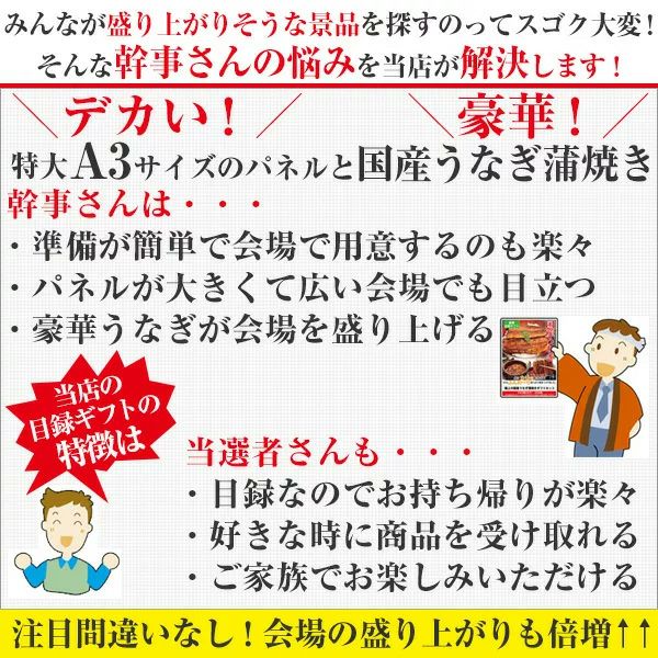 他の画像を見る 忘年会 新年会 結婚式二次会 イベント コンパ 宴会 福引 景品 ゴルフコンペ ビンゴ大会 にどうぞ♪ [幹事さん楽々]国産うなぎの目録ギフト国産うなぎ蒲焼き並盛りセット[1万円コース 景品 目録 グルメギフト] WEB本店特別価格 ¥ 10,000 税込 詳細を見る お気に入りに登録する