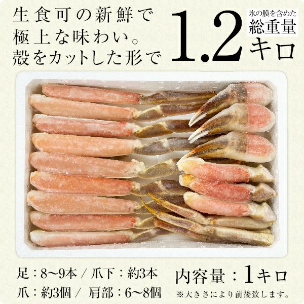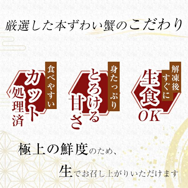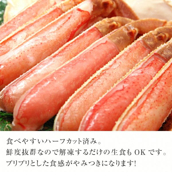 他の画像を見る 鮮度抜群!生食可!ハーフポーション! 生ズワイ蟹1kg(総重量1.2kg)食べやすい殻カット済み[ズワイガニ かに カニ] WEB本店特別価格 ¥ 7,230 税込 詳細を見る お気に入りに登録する