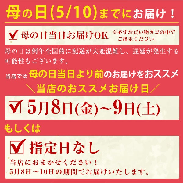 他の画像を見る お母さんにありがとうの気持ちを込めて! [今年は5月10日]母の日限定ギフトボックス[母の日 プレゼント 贈答用]※こちらの商品は箱のみとなります。中身となる商品は別途ご一緒にご注文くださいませ。 WEB本店特別価格 ¥ 310 税込 販売開始前です。 販売期間 2026/04/01 10:00 〜 2026/05/19 9:59 詳細を見る お気に入りに登録する